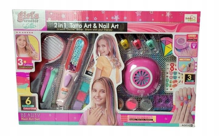 ZESTAW 2w1 KOLOROWE WŁOSY + MANICURE Zestaw MANICURE zawiera: - 3 kolorowe lakiery i 3 brokaty, - 2 separatory ułatwiające dekoracje paznokci, - Kolorowy pilnik w kształcie diamentu, - Funkcjonalna suszarka (2 x AA, zestaw nie zawiera), - Arkusz kolorowych naklejek na paznokcie. Zestaw KOLOROWE...