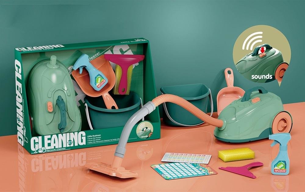Duży zestaw do sprzątania. W jego skład wchodzi odkurzacz, wiaderko, szufelka, pojemnik do spryskiwania oraz gąbka i maszynka do zbierania wody.Odkurzacz na baterie - 2 x AA (niedołączone). przeczytaj całość