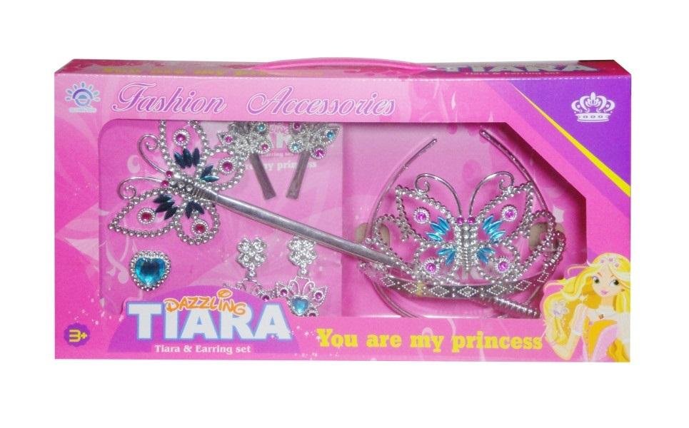 Zestaw dla małej księżniczki: tiara, różdżka, kolczyki, pierścionek i spinki. Zestaw spradzi się idealnie jako uzupełnienie stroju na balik przebierańców.#&Produkt zapakowany w kartonowe opakowanie z przezroczystym okienkiem. #&Podane wymiary są wymiarami opakowania.#&Zabawka dla dzieci od 3 lat. przeczytaj całość