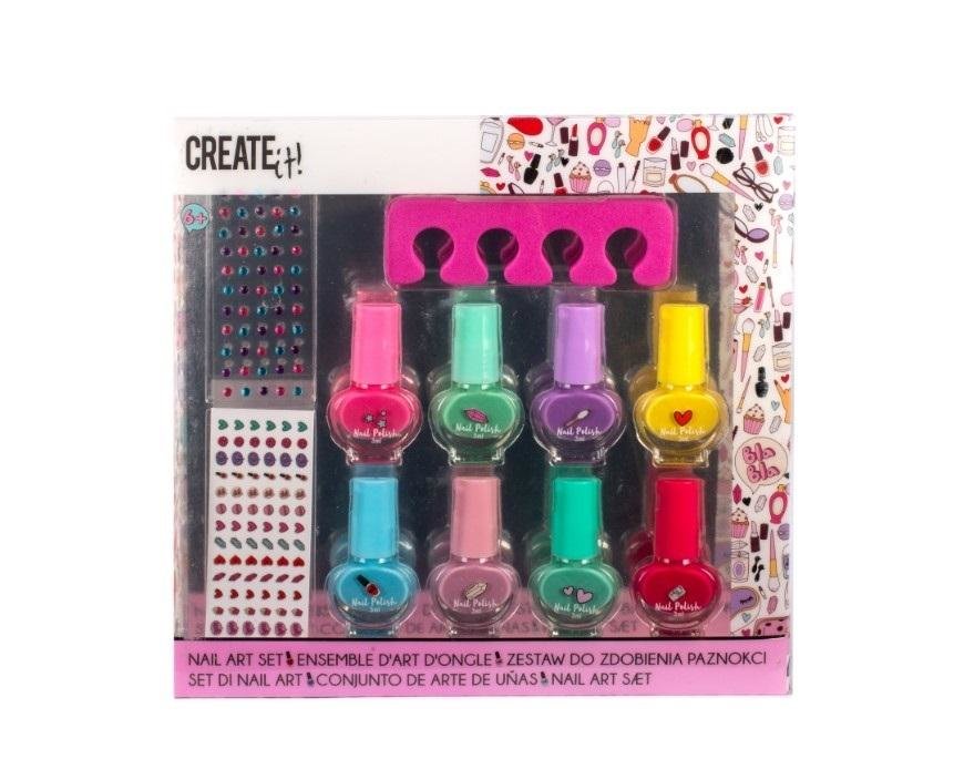 Zestaw do zdobienia paznokci. Wybierz jeden z jasnych kolorów zawartych w tym zestawie i zacznij malować paznokcie. Wykończ je wszystkie jasnymi diamentami i naklejkami. Zestaw zawiera 8 lakierów do paznokci, diamenciki i naklejki do ozdoby oraz separator. W zestawie znajduje się 8 lakierów, separator, arkusz naklejek i arkusz diamentów do ozdabiania.