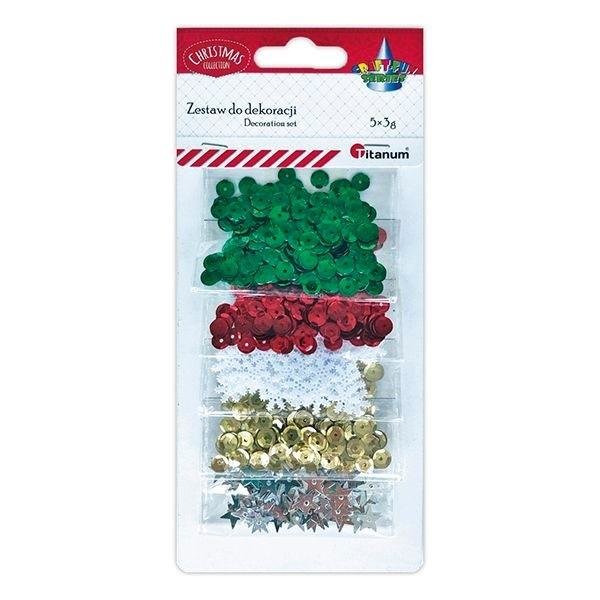 Zestaw cekinów 5 wzorów i kolorów x 3 g, okrągłe 7 mm zielone, czerwone, złote, płatki śniegu 11 mm białe, gwiazdki 10 mm srebrne. przeczytaj całość