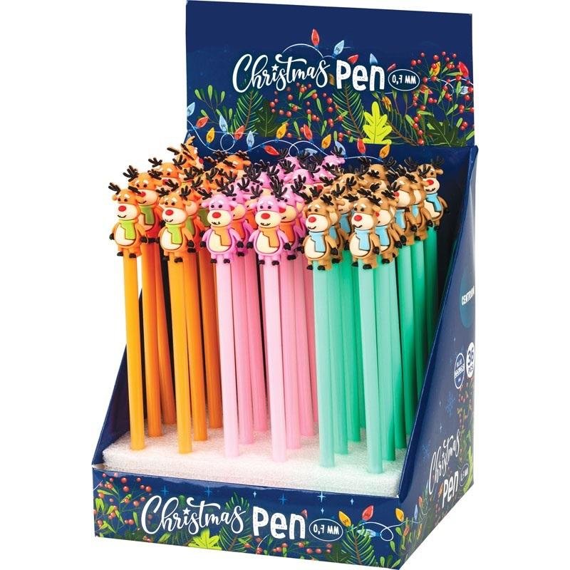 Opakowanie zbiorcze 36 sztuk.Fantazyjny długopis zamykany na skuwkę zakończony figurką renifera, pakowany na displayu (36). Tusz w kolorze niebieskim. przeczytaj całość