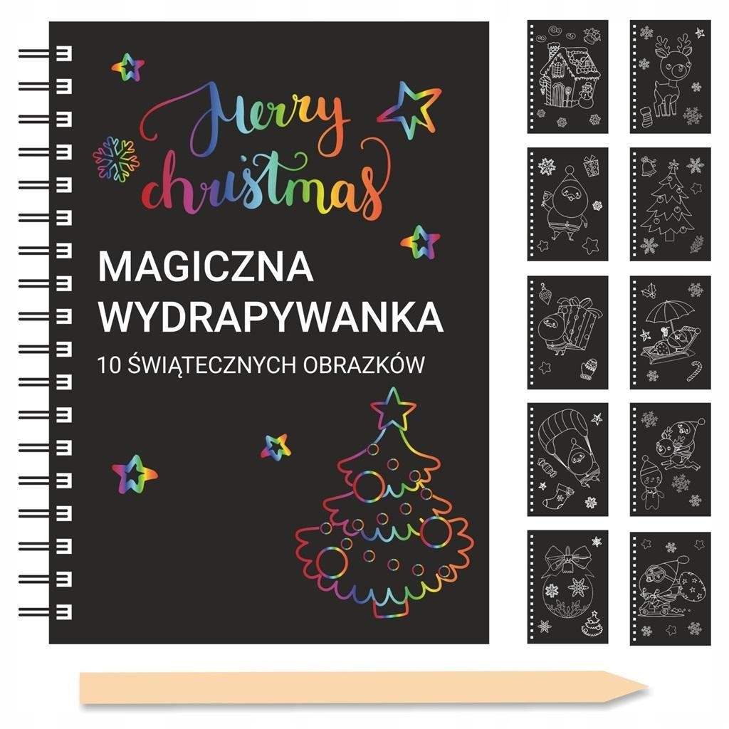 Magiczna Wydrapywanka Merry Christmas świąteczne obrazki magiczny notes wydrapywanka obrazki o tematyce świątecznej do wydrapywania pod czarną farbą do zdrapywania znajduje się tęczowy zadruk 10 obrazków na spirali świetna zabawa kreatywna dla dzieci w różnym wieku uczy...
