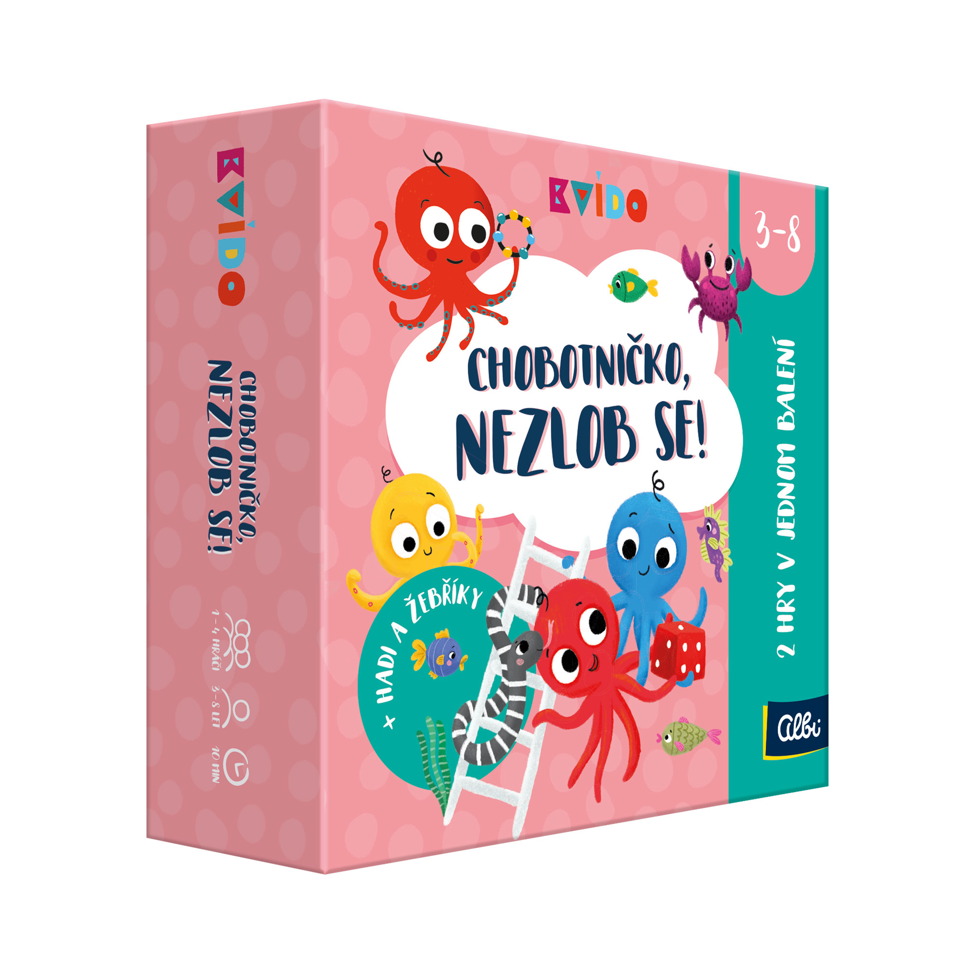 Ten zestaw zawiera popularne gry Kvído - Chobotničko, nie złoś się oraz Węże i drabiny z uroczymi drewnianymi figurkami ośmiorniczek, które dzieci pokochają. Gry zostały zaprojektowane dla początkujących graczy od 3. roku życia, którzy nauczą się podstaw zasad gier planszowych, rozwijają strategię, a jednocześnie będą się świetnie bawić. Przeznaczone dla 2-4 graczy, czas gry to około 10 minut, co czyni je doskonałym wyborem na spokojne chwile w domu i w podróży.