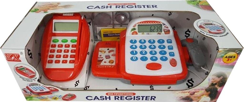 Plastikowa kasa sklepowa ze skanerem i z akcesoriami (pieniędzmi). Szuflada otwiera się za pomocą przycisku na kasie. Produkt posiada także czytnik kart kredytowych i działający kalkulator. Do zestawu dołączono także teminal płatniczy. Produkt działa na baterie typu AA. Baterie nie znajdują się w zabawce. Zabawka przeznaczona dla dzieci powyżej 3 roku życia. Produkt zapakowany w kartonowe opakowanie z oki