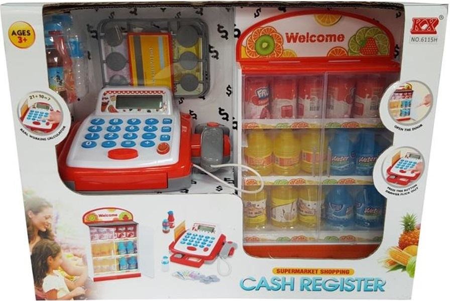 Plastikowa kasa sklepowa ze skanerem i z akcesoriami (pieniędzmi). Szuflada otwiera się za pomoca przycisku na kasie. Skaner świeci kolorowym światełkiem. Produkt posiada także czytnik kart kredytowych i działający kalkulator. Ponad to w zestawie dołączono także otwieraną lodówkę z napojami,...
