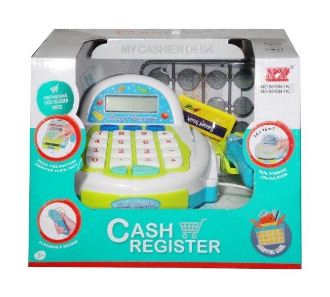 Plastikowa kasa sklepowa ze skanerem i z akcesoriami (pieniędzmi). Szuflada otwiera się za pomocą przyciśnięcia klawisza z kasy. Skaner świeci kolorowym światełkiem i wydaje dźwięki. Produkt działa na baterie typu AA. Brak baterii w zestawie. Zabawka przeznaczona dla dzieci powyżej 3 roku życia. Produkt zapakowany w kartonowe opakowanie z okienkiem. Podane wymiary stanowią wymiar opakowania.