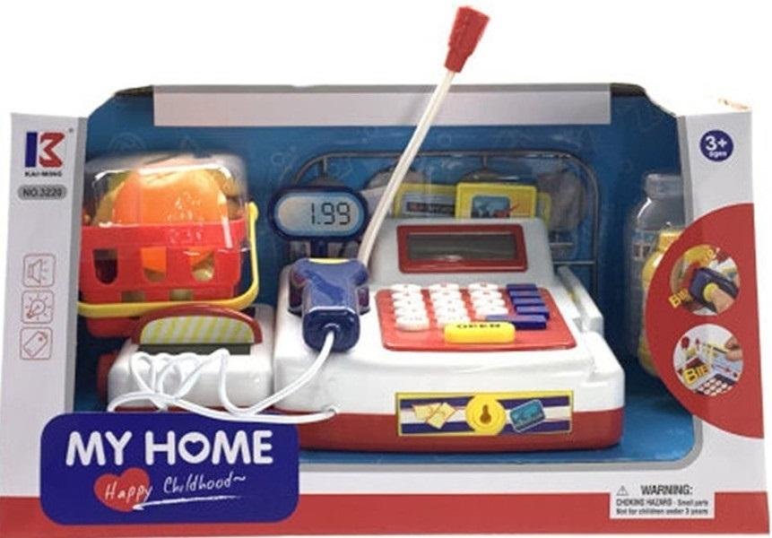 Plastikowa kasa sklepowa ze skanerem i z akcesoriami (pieniędzmi). Do zestawu dołączono także koszyk zakupowy z artykułami spożywczymi. Szuflada kasy otwiera się za pomocą przycisku na kasie. Produkt posiada także przesuwaną taśmę na produkty. Skaner świeci kolorowym światełkiem i wydaje dźwięki....