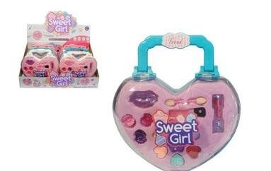 Kolorowe kosmetyki dla dziewczynek zamknięte w stylowym pudełku w kształcie serca. W zestawie znajduje się: błyszczyk, pomadka oraz cienie do powiek a także aplikatory, jak również kolorowe spinki do włosów. Produkt dla dzieci od 3 lat. Produkt występuje w kilku wersjach kolorystycznych, wybierany losowo. Cena dotyczy jednej sztuki. Podane wymiary sa wymiarami opakowania.