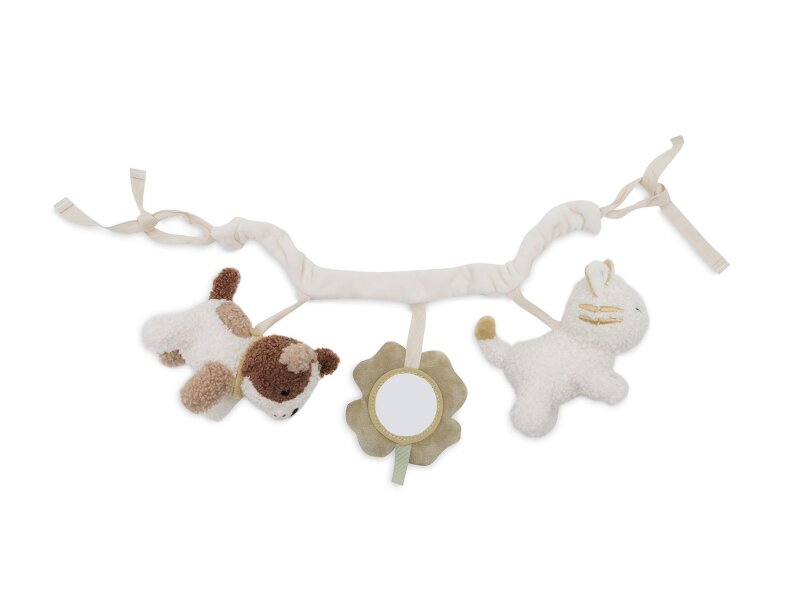 Řetěz na kočárek či autosedačku se zavěšenými hračkami v podobě pejska, kočičky a čtyřlístku s bezpečným zrcátkem zabaví vaše miminko v kočárku či autosedačce. Měkké hračky vyrobené z jemného plyše cinkají a nabízí různé textury pro zkoumání. Hračky stimulují koordinaci ruka / oko dítěte.Řetěz s...
