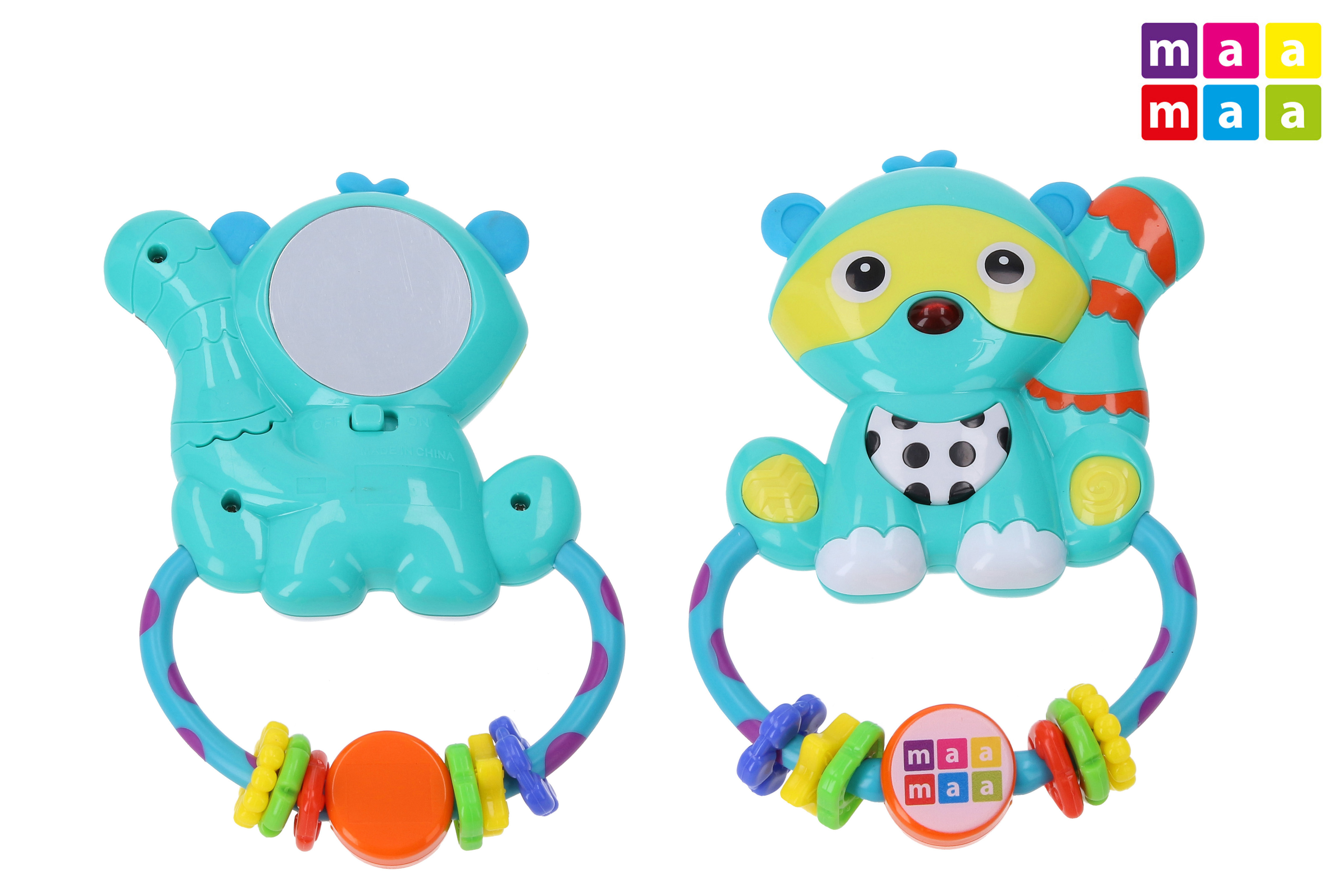 Pluszowy szop pracz. Długość 17 cm. Wydaje efekty świetlne i dźwiękowe. Zabawka zasilana jest bateriami 2xLR44. przeczytaj całość