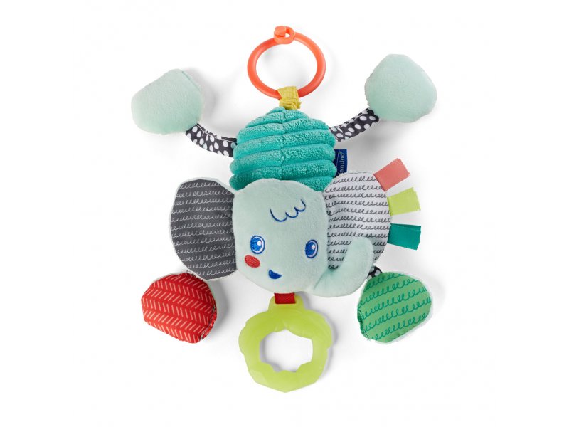Plyšová hračka v podobě rošťáckého slona zabaví vaše dítě na cestách v kočárku či autosedačce. Zatáhněte za kousátko a sledujte spolu s dítětem, jak slon vibruje! Pozornost dítěte upoutají výrazné barvy a různorodé textury ke zkoumání. Kousátko pomáhá dítěti při prořezávání prvních zoubků.Hračku...