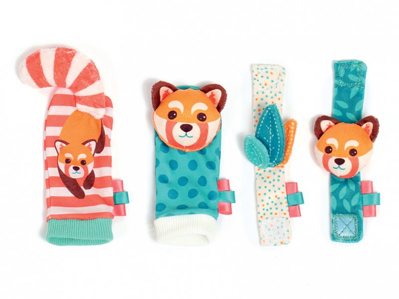 Dzięki przymocowaniu na nadgarstki za pomocą rzepu i naciągnięciu na nóżki zabawki przyciągają uwagę dziecka kolorowymi wzorami i wesołymi pyszczkami pandy, które chętnie ogląda. Różne faktury grzechotek oferują przyjemne doznania dotykowe, natomiast efekty dźwiękowe przyciągają uwagę i wspierają umiejętności ruchowe - dzieci zwracają się w stronę dźwięku, co motywuje ich do pierwszych aktywnych reakcji na otoczenie.