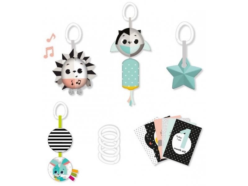 Sada hraček ve výrazných kontrastních barvách z kolekce Tiny Love Magical Tales byla pečlivě sestavena pro podporu vývoje dítěte od narození. V sadě najdete čtyři závěsné hračky (hudebního ježka, šusticí hračku, cinkající sovu a hvězdičku), 4 závěsné propojitelné kroužky a 12 očíslovaných karet...