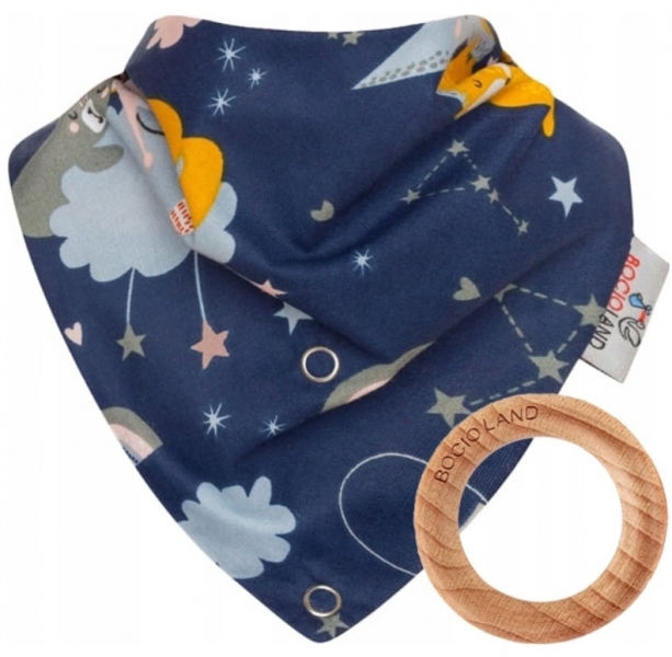 Šátek s dřevěným kousátkem svým tvarem a způsobem výroby plní různé funkce - jak bryndáček, který zakrývá oblečení miminka při krmení, tak šátek chránící krk, který je součástí oblečení miminka. Výrobek je vyroben ze dvou vrstev 100% bavlněného materiálu, navíc má kousátko vyrobené z...