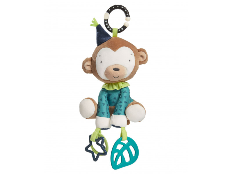 Roztomilá opička zabaví vaše miminko! Textilní hračku ve veselých kontrastních barvách snadno připevníte ke kočárku, autosedačce či postýlce. Opička při pohybu cinká, některé části šustí a kousátka uleví citlivým dásním při prořezávání prvních zoubků. Vhodné pro děti od narození.  przeczytaj całość