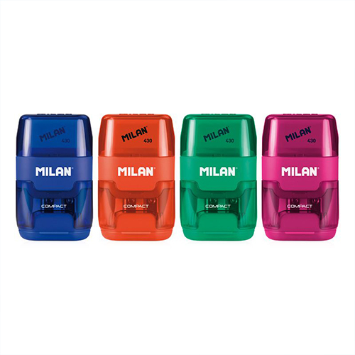 Kombinovaná guma 430 a dvojité strúhadlo (štandardné a veľkosti MAXI), dizajn COMPACT. Štvorcová guma je vyrobená zo syntetickej gumy. Orezávač na ceruzky má ostré a odolné oceľové ostrie, vďaka čomu je ideálny pre všetky druhy ceruziek. Disponuje tiež bezpečnostným systémom čepele, ktorý zabraňuje odtrhnutiu čepele od tela strúhadla. 4 rôzne farby: modrá, oranžová, ružová a zelená.