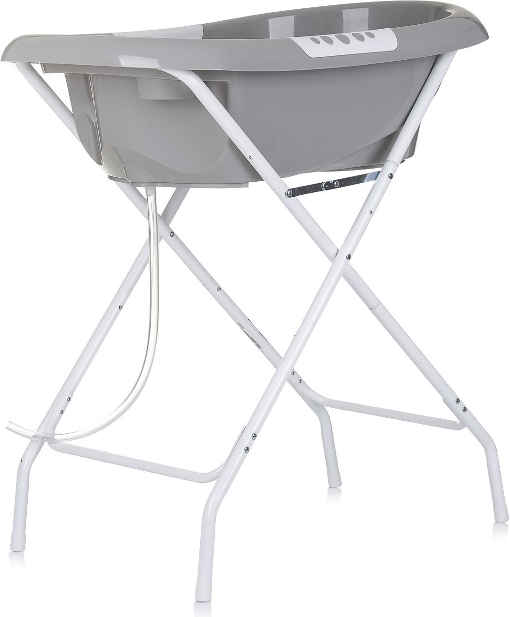 można używać na stojaku lub samodzielnie, antypoślizgowa powłoka na dnie i bokach wanienki, wbudowany uchwyt na mydło i szampon, wyposażona w korek ułatwiający spuszczanie zużytej wody, składany stojak pod wanienkę dla wygody rodziców, wymiary zewnętrzne (wanienka + stojak): 91 x 89 x 53 cm, wymiary wewnętrzne wanienki: 27 x 55 x 32 cm ,