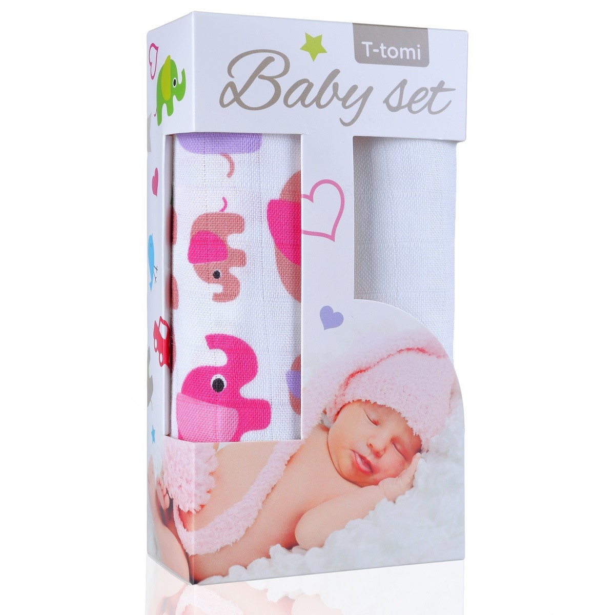 Baby set - bambusová osuška pink elephants / růžoví sloni + bambusová osuška white / bílá