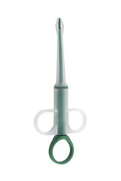 Zastosowanie aplikatora: Umieść tabletkę między końcowymi szczękami, chwyć aplikator tak, aby kciuk był przygotowany w zielonym uchwycie tłoka. Wsuń aplikator do pyszczka zwierzęcia aż do nasady języka. Tłokiem wypuść tabletkę, szybko zamknij pyszczek zwierzęcia i lekko odchyl głowę do tyłu, aby zmusić je do przełknięcia.