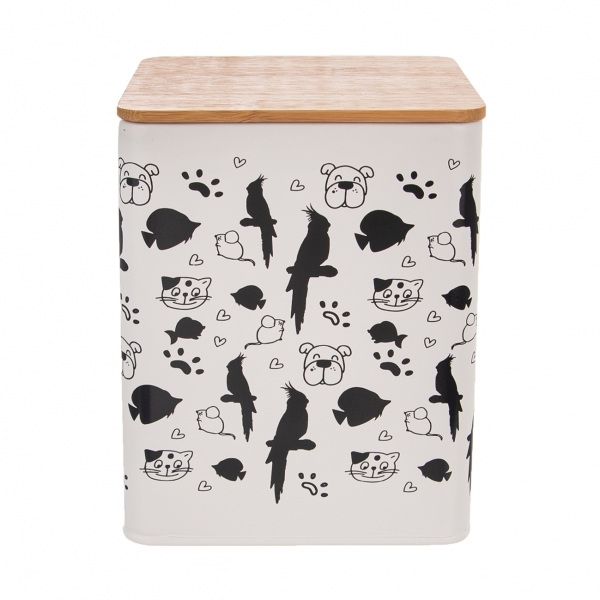 Pojemnik prostokątny z pokrywką do przechowywania karmy, przysmaków lub ciastek dla zwierząt domowych... Materiał: blacha, drewniana pokrywka, silikonowa uszczelka. Wymiary: 11,5x11,5x14 cm. przeczytaj całość