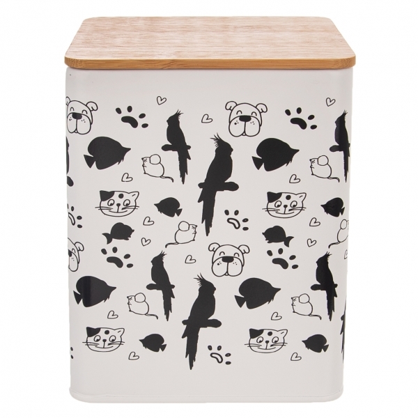 Ten prostokątny pojemnik o wymiarach 14x14x16,5 cm wykonany jest z wysokiej jakości blachy i wyposażony w eleganckie drewniane wieczko z silikonową uszczelką, która zapewnia szczelność i zachowanie świeżości zawartości. Dzięki kompaktowym rozmiarom pojemnik łatwo zmieści się w spiżarni lub na półce, a jego elegancki design doskonale uzupełni wystrój wnętrza. Koniec z bałaganem i rozsypanymi przysmakami - to praktyczne i estetyczne rozwiązanie do codziennej pielęgnacji Twojego pupila.