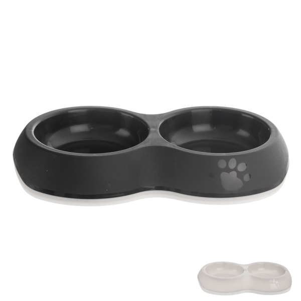 Dvojmiska pro psy. Díky protiskluzovému dnu se nesmeká po podložce. Mix barev - černá, světle šedá. Materiál: plast, termoplastická guma. Rozměry: 26x15x4,5 cm, pr. misek 10,5 cm. przeczytaj całość
