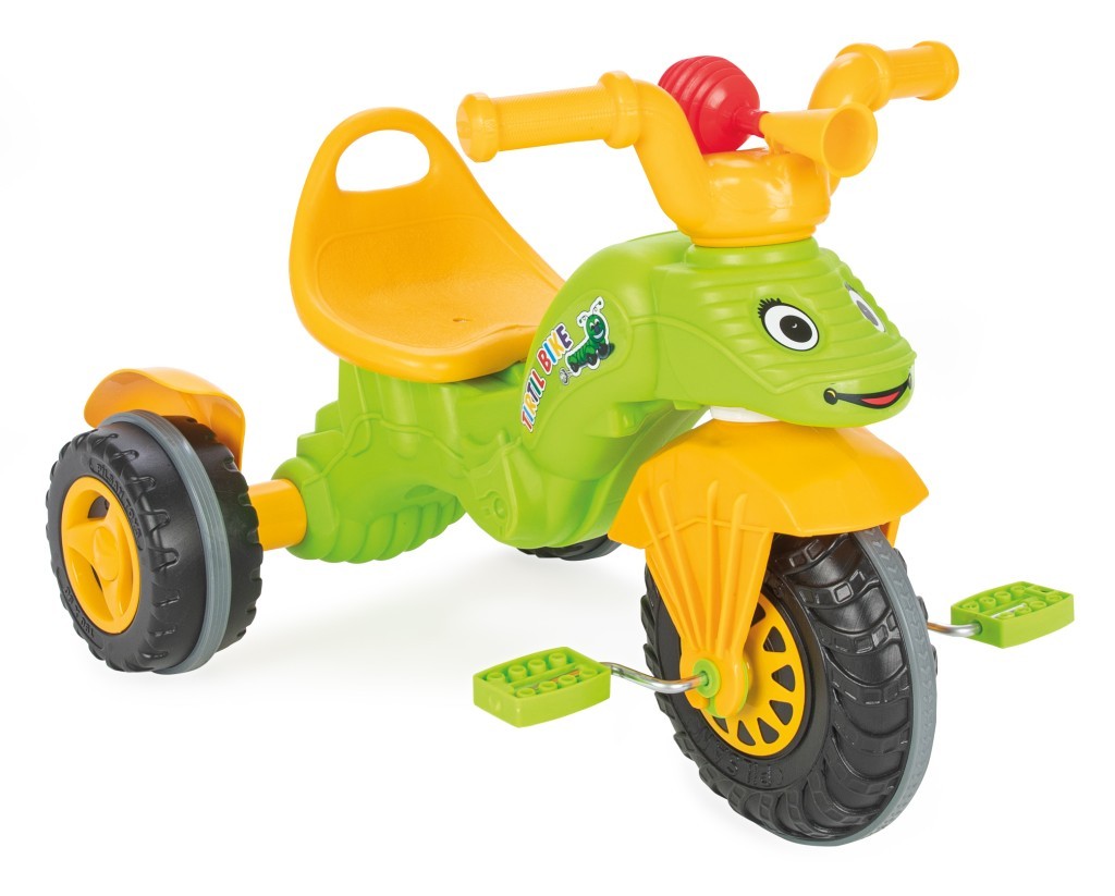 Tříkolka ve tvaru housenky, šlapky umístěny na předním kole. Nosnost 35 kg, ergonomický design. Mechanický klakson. przeczytaj całość
