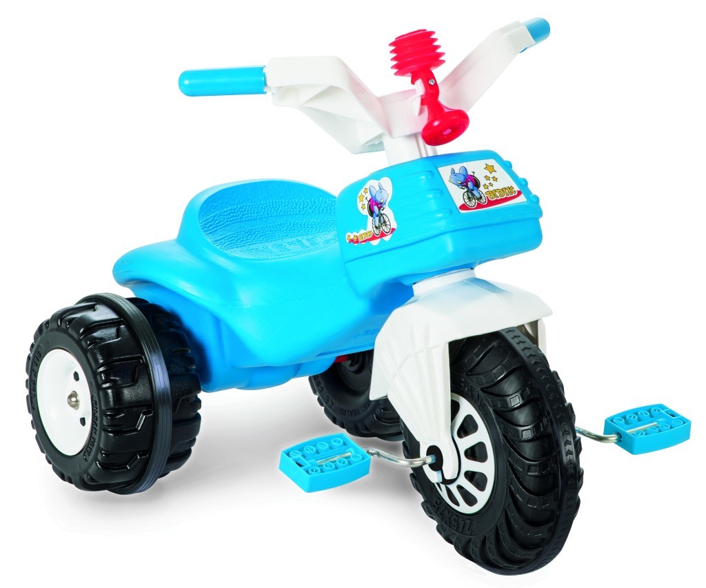 Tříkolka Tuby modrá s klaksonem. Ovládá se pedály na předním kole, plastové pneumatiky a pohodlné sedlo. Maximální nosnost 35 kg. przeczytaj całość