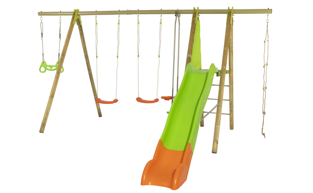kruhy a skluzavky s délkou skluzu 263 cm. Houpačky jsou zavěšeny na