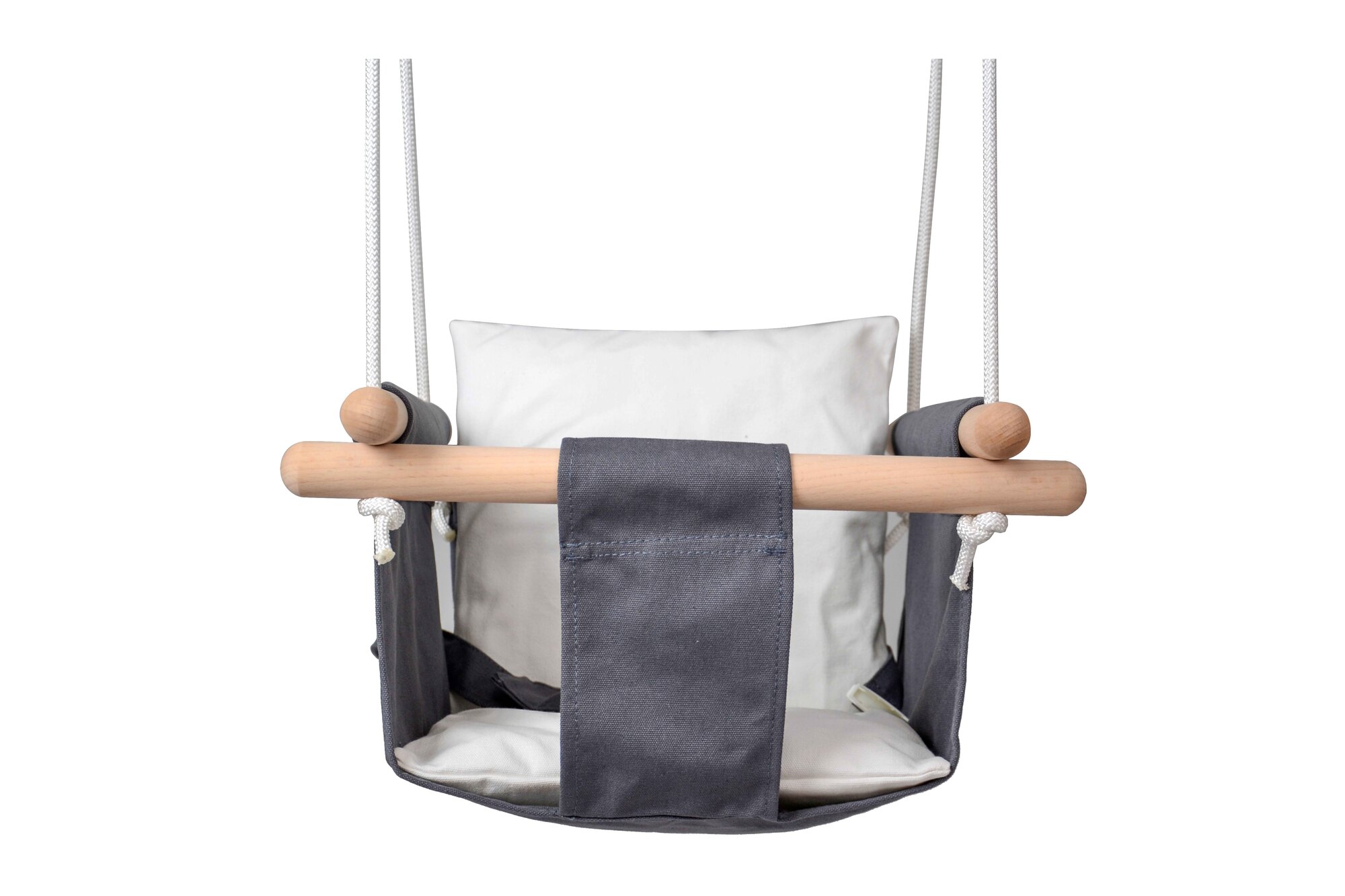 Houpačka plátěná šedá. 100% bavlna. Délka závěsných lan 1,8 m. Polyesterová lana o průměru 7 mm. Délka dřevěných opěrek 40 cm. Nosnost 80 kg. przeczytaj całość