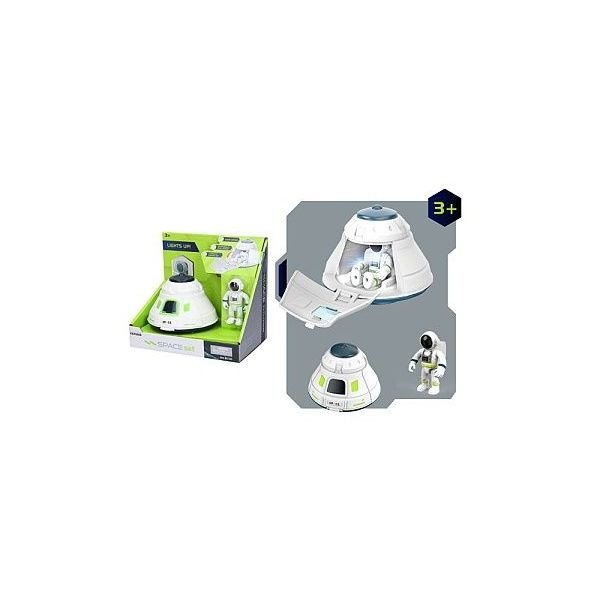 Vesmírný set s figurkou. Velikost figurky 7,5 cm. Přistávací modul 13 cm. Součástí přistávací modul, figurka kosmonauta. Otevírací dveře. Světelné efekty modulu - aktivace posazením kosmonauta do modulu. Doporučený věk. od 3 let 2xAG13 baterie do modulu součástí. przeczytaj całość