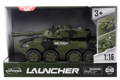 Tank na baterie. Napájení na 3xAG13 baterie, které jsou součástí balení. Tank je na setrvačník. Materiál plast. Na střeše 4 tlačítka se zvuky. Baleno v otevřené krabici v sáčku. Rozměry balení 30x19x12,5 cm. Věk 3+ przeczytaj całość