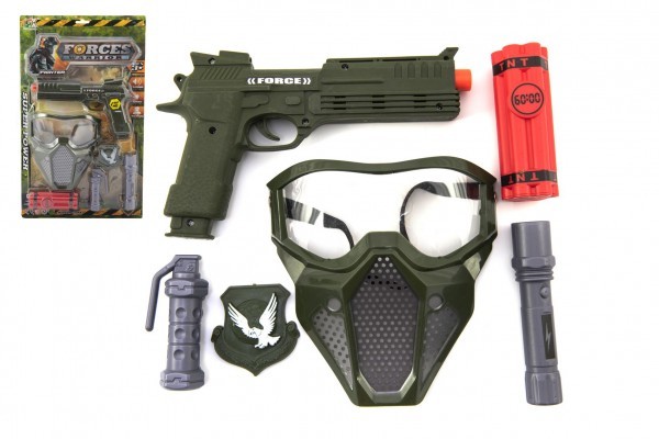 Vojenská sada plast pistole na baterie se zvukem se světlem s doplňky na kartě 26x43x5cm