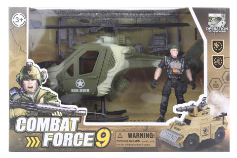 Ten zestaw wojskowy zawiera helikopter o wymiarach ok. 22 x 13 cm, żołnierzyka i broń. Wymiary opakowania ok. 27,5 x 18 x 11,5 cm. Wiek 3+ przeczytaj całość