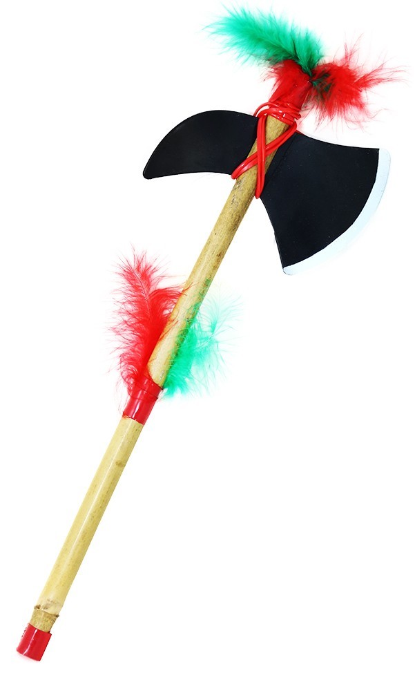 Indiánská karnevalová sekera o velikosti 38 cm. Sekera je vyrobena z PVC a gumy, také je zdobena barevným peřím. Perfektní ke kostýmu indiána! przeczytaj całość