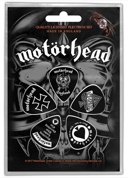 Oficiální kytarová trsátka a doplňkové zboží z katalogu produktů s logem, fotografiemi a grafikou skupiny Motorhead.