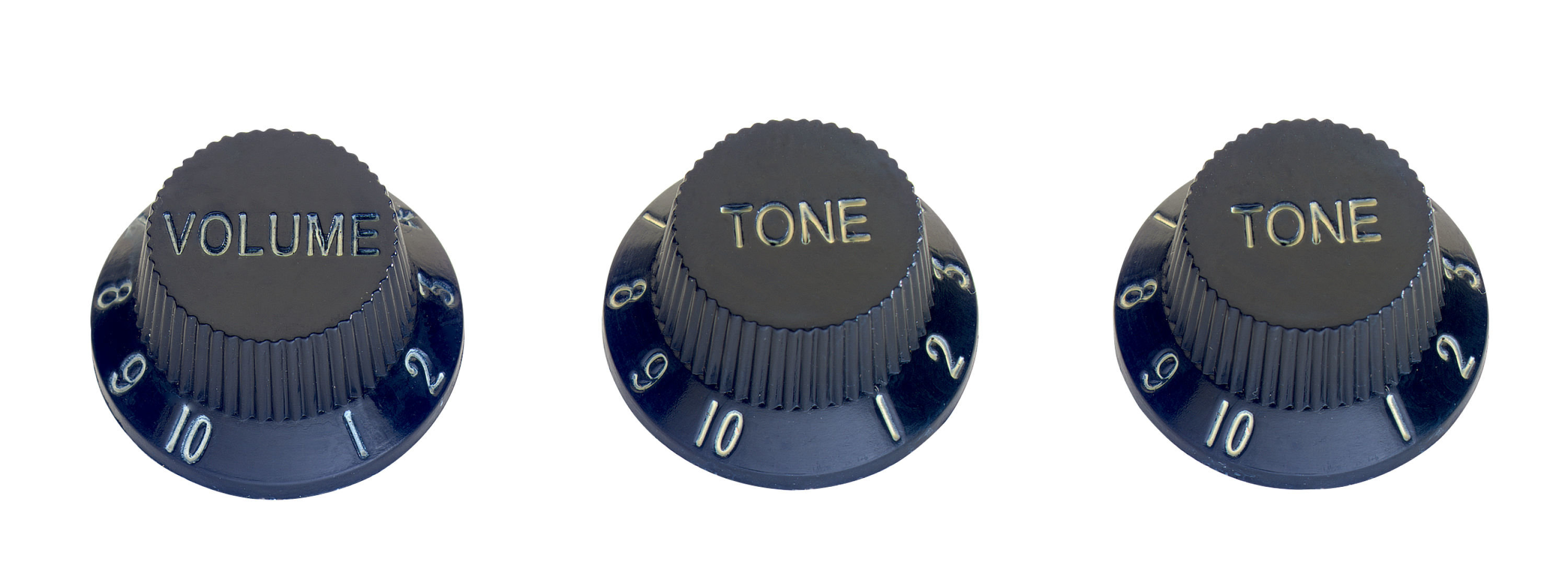 Sada knoflíků na potenciometry pro elektrickou kytaru typu Strat, 2x Tone, 1x Volume, barva černá, bílý popis. przeczytaj całość