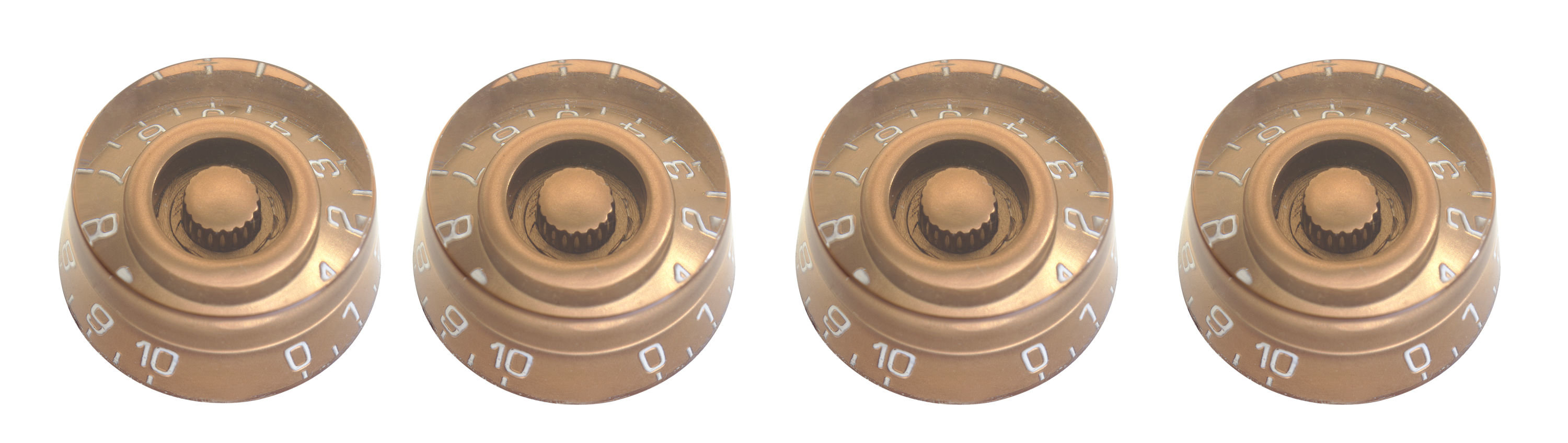 Sada knoflíků na potenciometry pro elektrickou kytaru typu LP, 2x Tone, 2x Volume, barva zlatá, bílý popis. przeczytaj całość