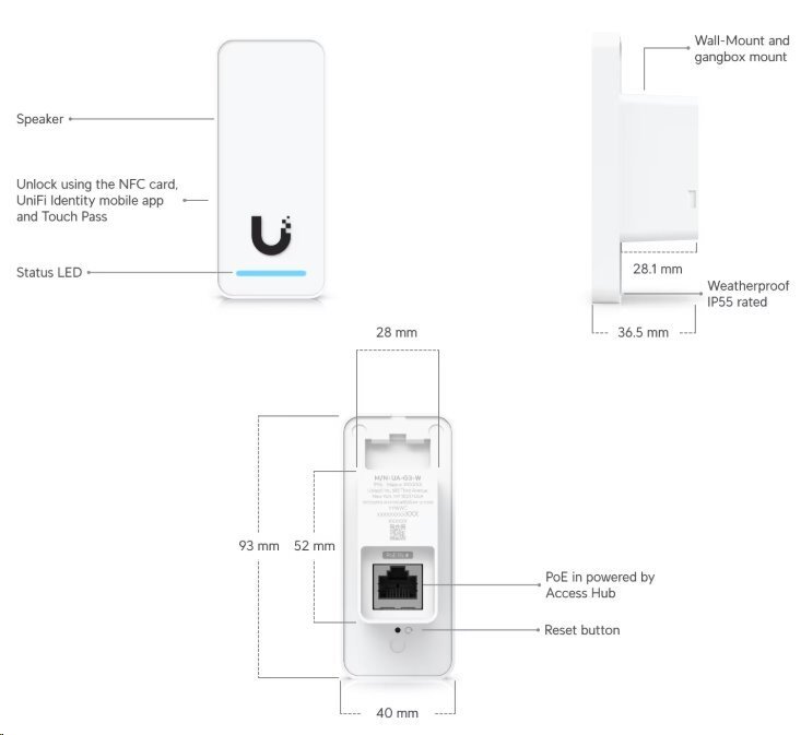 OverviewDimensions 93 x 40 x 36.5 mm (3.7 x 1.6 x 1.4")NFC Card & Keyfob Access YesApple Touch Pass YesMobile Unlock YesHandwave Request to Exit YesWeatherproofing...