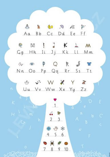 Abecední pomůcka formou vizuální nápovědy. Ke každému písmenu velké abecedy a číslici je přiřazen obrázek Comenia Pictures.