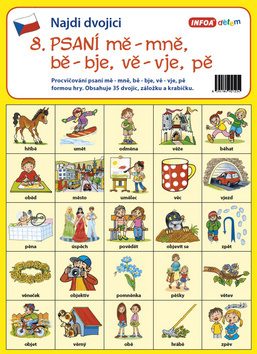 Ćwiczenie pisowni mě - mně, bě - bje, vě - vje, pě w formie gry. Zawiera 35 par, zakładkę i pudełko. Zasady gry: Gra przeznaczona jest dla co najmniej 2 graczy. Kartoniki przetnij, potasuj i rozłóż obrazkami do dołu na powierzchni. Każdy gracz odkrywa jedną kartę i, odkrywając drugą, szuka pary do obrazka. Jeśli nie trafi, odkłada je z powrotem na pierwotne miejsce. Jeśli trafi, zabiera parę i kontynuuje grę. Zwycięzcą zostaje gracz, który znalazł najwięcej obrazkowych par.