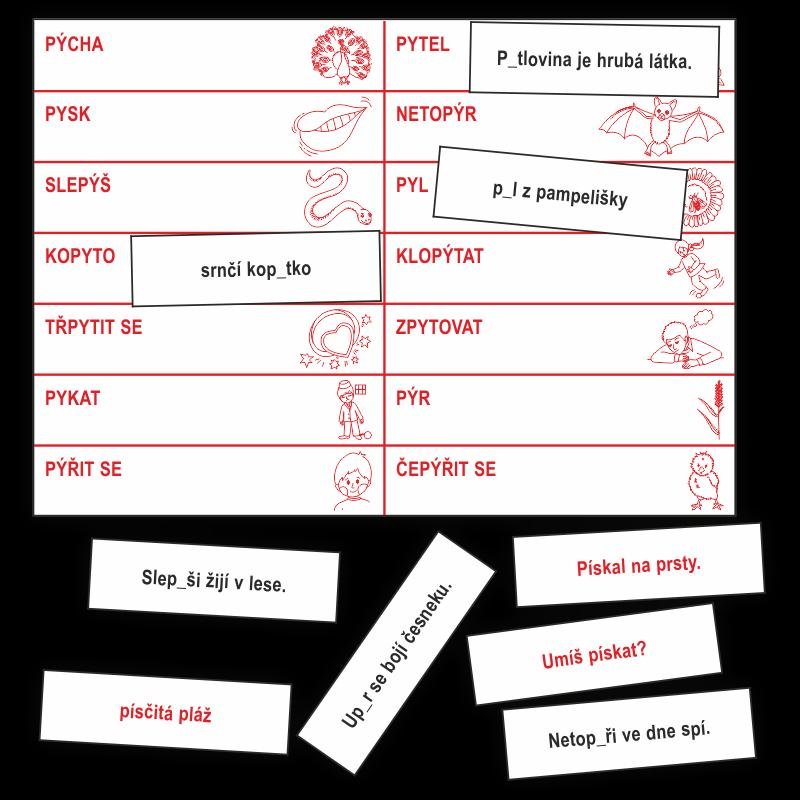 Vyjmenovaná slova - kartičky k procvičování Y, Ý, I, Í po obojetných souhláskách v kořenu slova