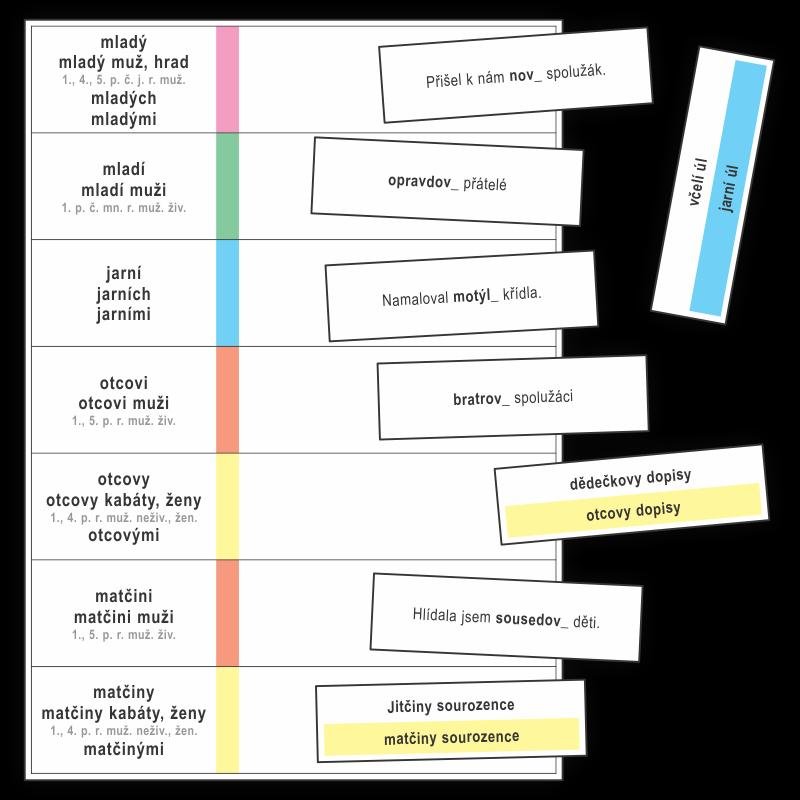 Koncovky přídavných jmen - kartičky k procvičování psaní I, Í, Y, Ý v koncovkách přídavných jmen a k procvičování vzorů mladý, jarní, otcův a matčin