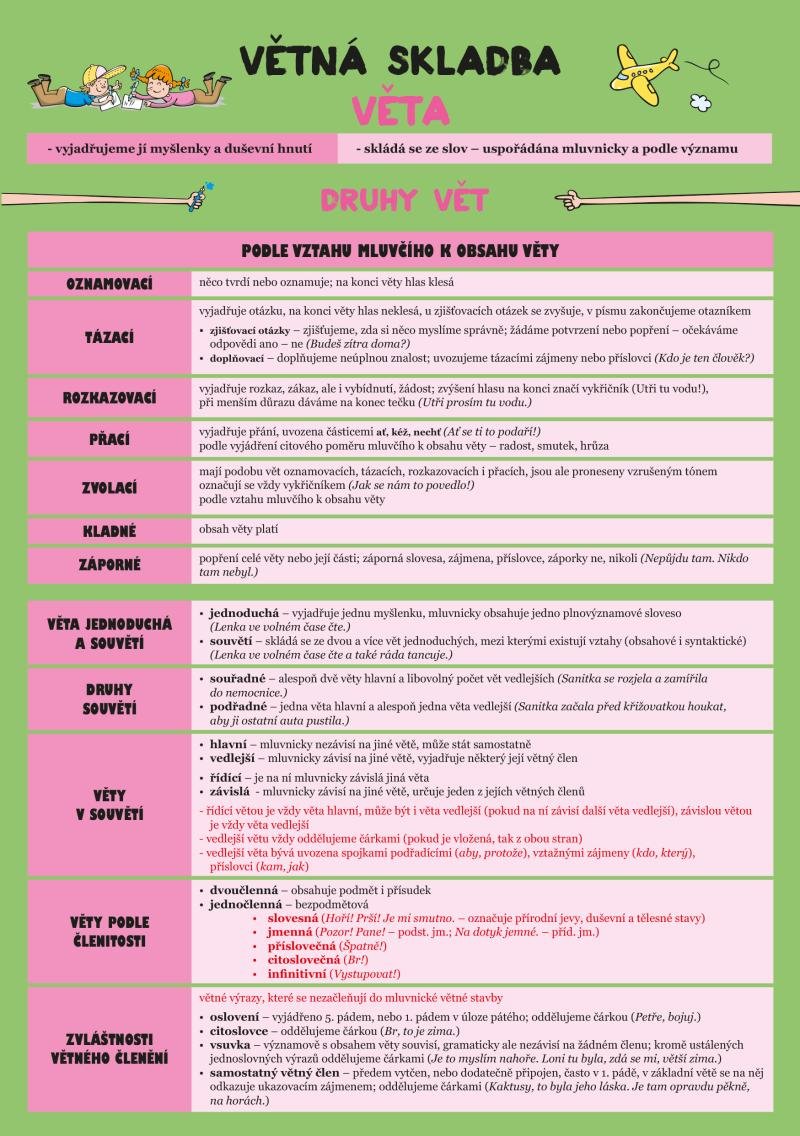 Ta laminowana karta jest przeznaczona przede wszystkim dla uczniów szkoły podstawowej i średniej. Na tej karcie bardzo zrozumiale przedstawiono problematykę czeskiego zdania złożonego. Znajdą tu rodzaje zdań, rodzaje zdań złożonych, rodzaje zdań podrzędnych, stosunki między zdaniami oraz części zdania. W tym ładnym wykonaniu karta powinna służyć uczniom jako punkt wyjścia do prawidłowego praktycznego zastosowania materiału podczas nauki.