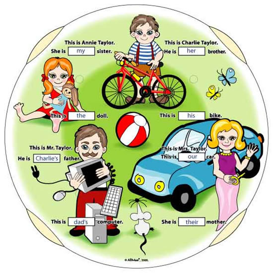 Zábavná oboustranná pomůcka je určena mimo jiné k zábavné výuce anglických členů (např. a, an, the), přivlastňovacích jmen (Annie‘s), číslovek (one) a ukazovacích zájmen (this, that). Otáčením jedním ze 4 koleček lze tvořit věty různých významů a poznat tak celý popis rodiny Taylorových a jejich domu. Díky své originalitě a dokonalé propracovanosti je pomůcka vhodným doplňkem při výuce anglického jazyka.