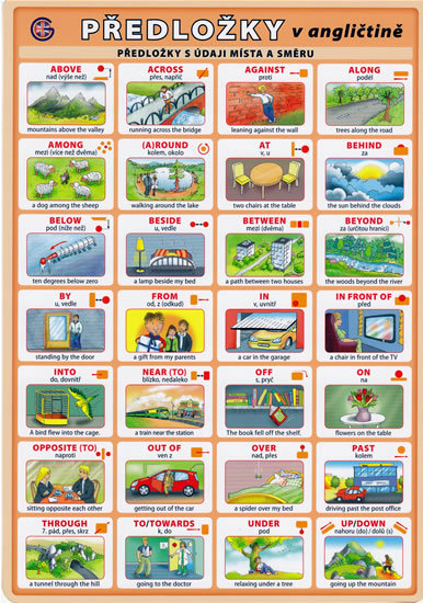 Angielskie przyimki z czeskim tłumaczeniem i ilustrowanym przykładem. Zawiera przyimki określające miejsce i kierunek, przyimki określające czas oraz związki przyimkowe; ilustracje Adolf Dudek. przeczytaj całość