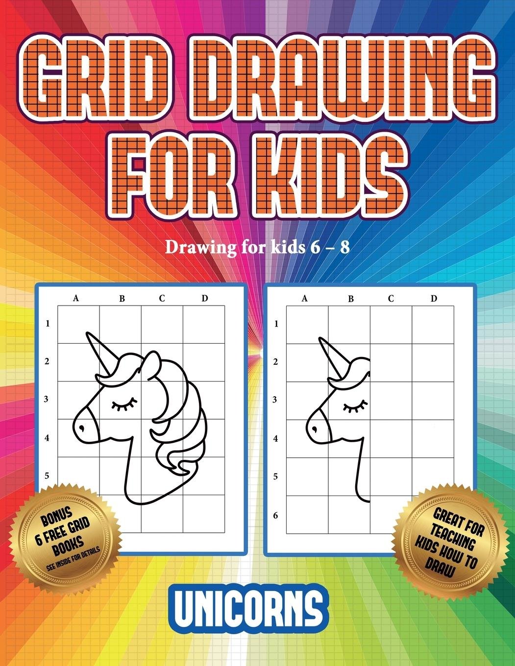 Drawing for kids 6 - 8 (Grid drawing for kids - Unicorns): This book teaches kids how to draw using grids (angielski)