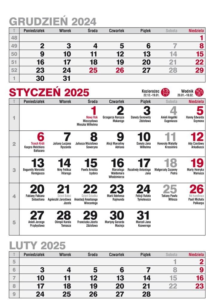 Kalendarz Biurkowy A5 TRÓJDZIELNY PIONOWY. Oprawa czarna spirala na grubej podstawie kartonowej. Format 145/210mm. Papier offsetowy, okładka papier kredowy. 26 strony (dwa układ miesięczne ) + okładka. Układ kalendarium w stylu kalendarza trójdzielnego ( z drugiej strony miejsce na notatki na każdy dzień) Mix wzorów, pakowany po 8szt. Kalendarz zawiera imieniny, nazwy świąt, numeracje tygodni, znaki zodiaku.