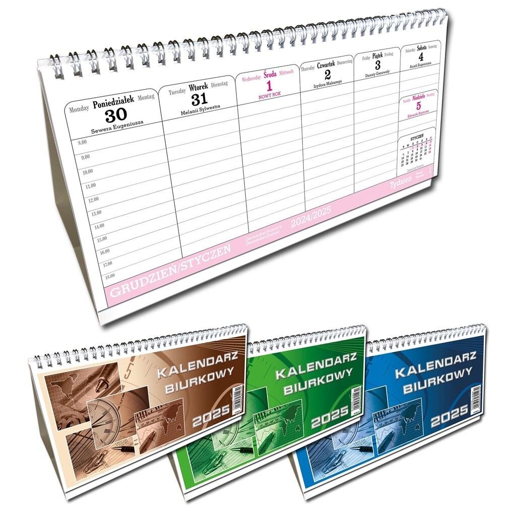 * kalendarz biurkowy* poziomy* układ: tygodniowy z podglądem miesięcznym* numeracja tygodni* imieniny* nazwy miesięcy i dni tygodnia w języku polskim, angielskim, niemieckim* spirala srebrna* idealny do biura i dla firm* wymiary: 29,5 x 16,5 cm* uwaga! produkt występuje w kilku wzorach okładek,... przeczytaj całość